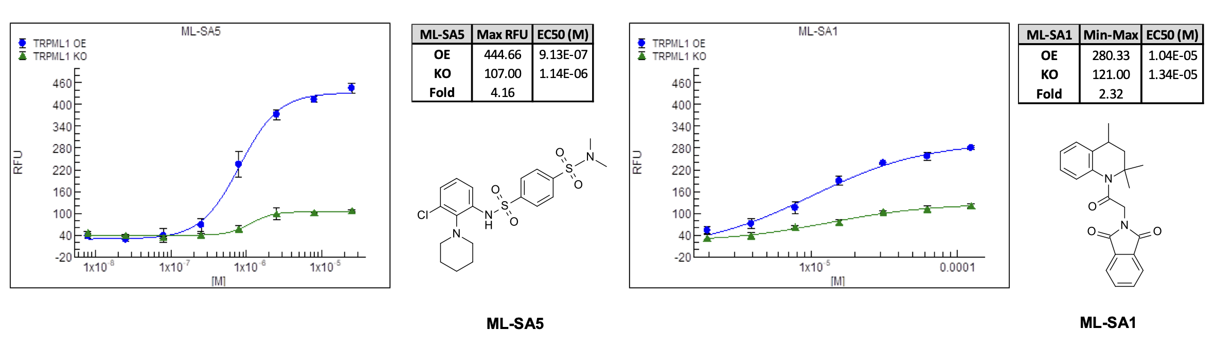 In early experiments commercially available TRPML1 activators ML‑SA5 and ML‑SA11 displayed similar potency in both overexpressing (OE) and knock‑out (KO) HEK293_TRPML1 cell lines. This non‑specific activity made it difficult to identify true TRPML1‑mediated Ca²⁺ release and threatened to compromise screening fidelity.