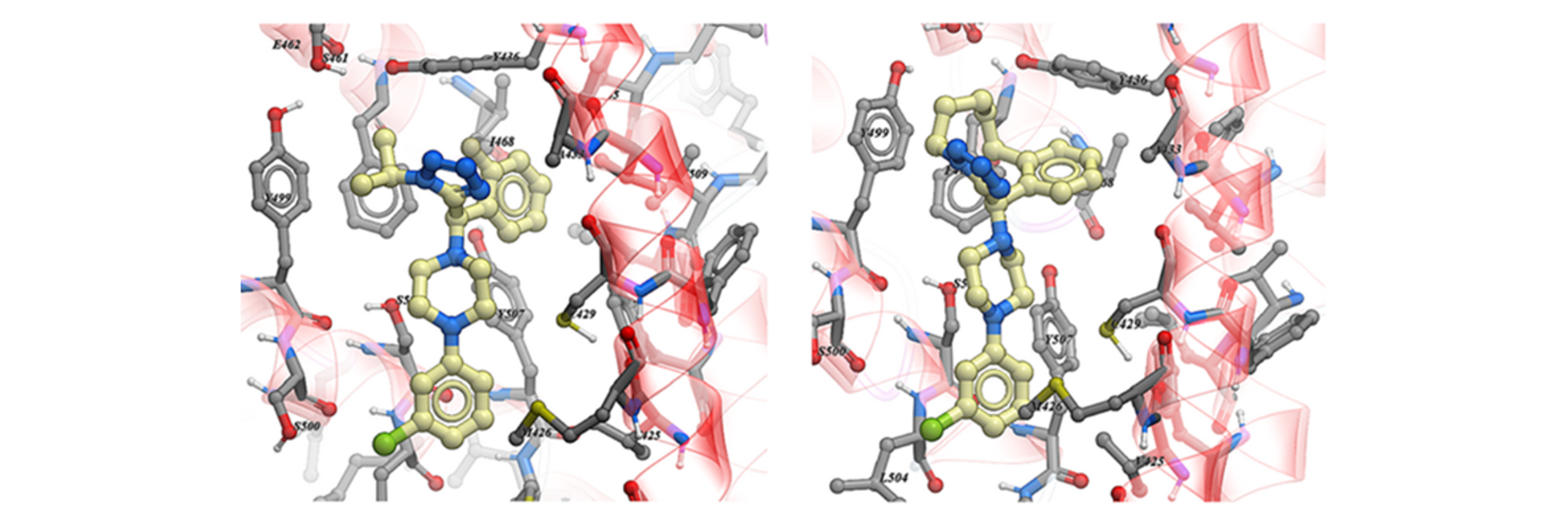 Figure 4. Docking pose of the most active BCC0092140 enantiomer 1a (left panel) and (R)-Compound 19 (right panel) into the TRPML1 Cryo-EM structure.