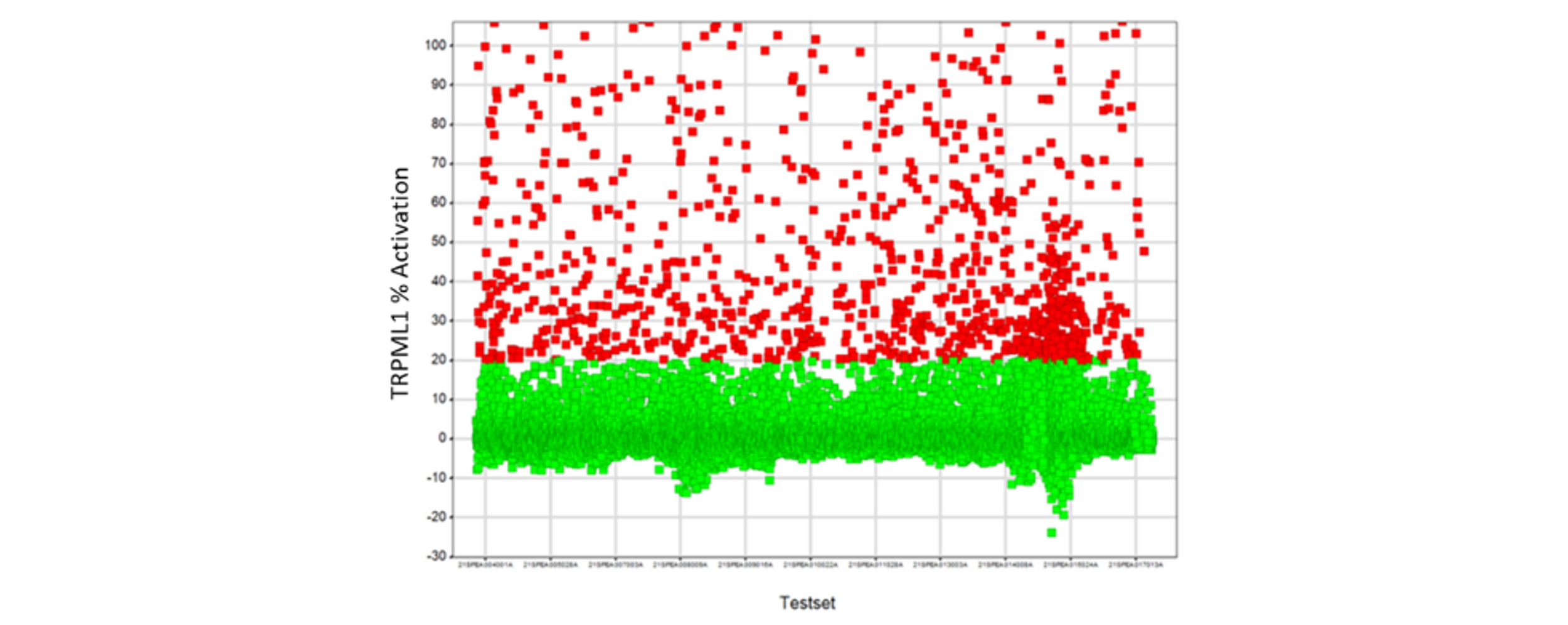 Figure 2: TRPML1 OE primary screen. ~1700 compound eliciting a response of ≥15% activation relative to 25 µM ML-SA5 control are highlighted in red and were progressed to active confirmation/deselection.