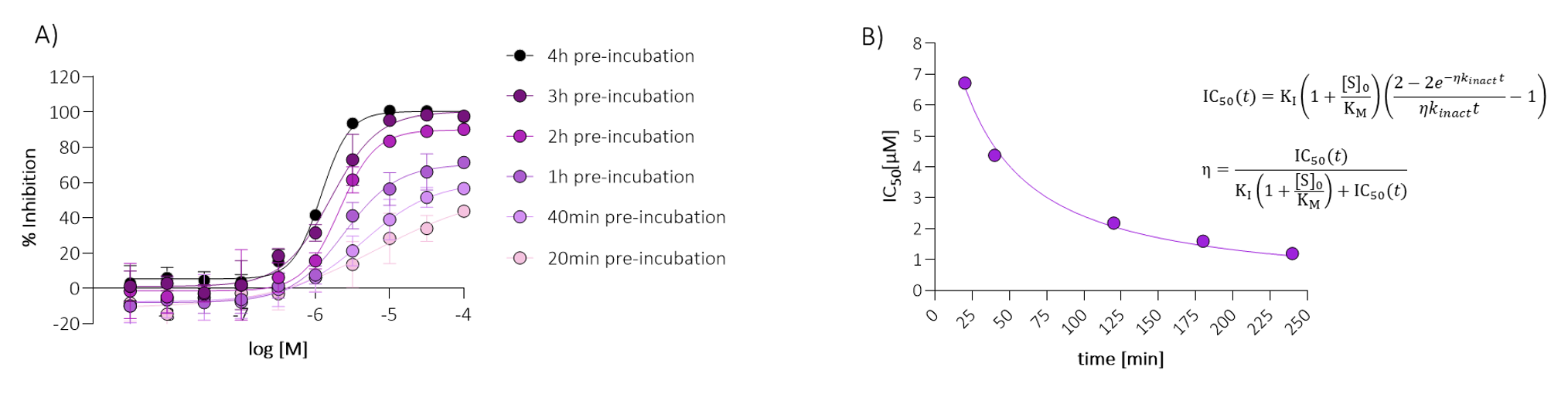 A covalent library of 1600 compounds was sourced from a commercial third party and screened in the primary assay at 100 µM. Enzyme activity was assessed at steady-state and from 77 hits identified in the initial single-point screen, 38 showed time-dependent inhibition (Figure 4).