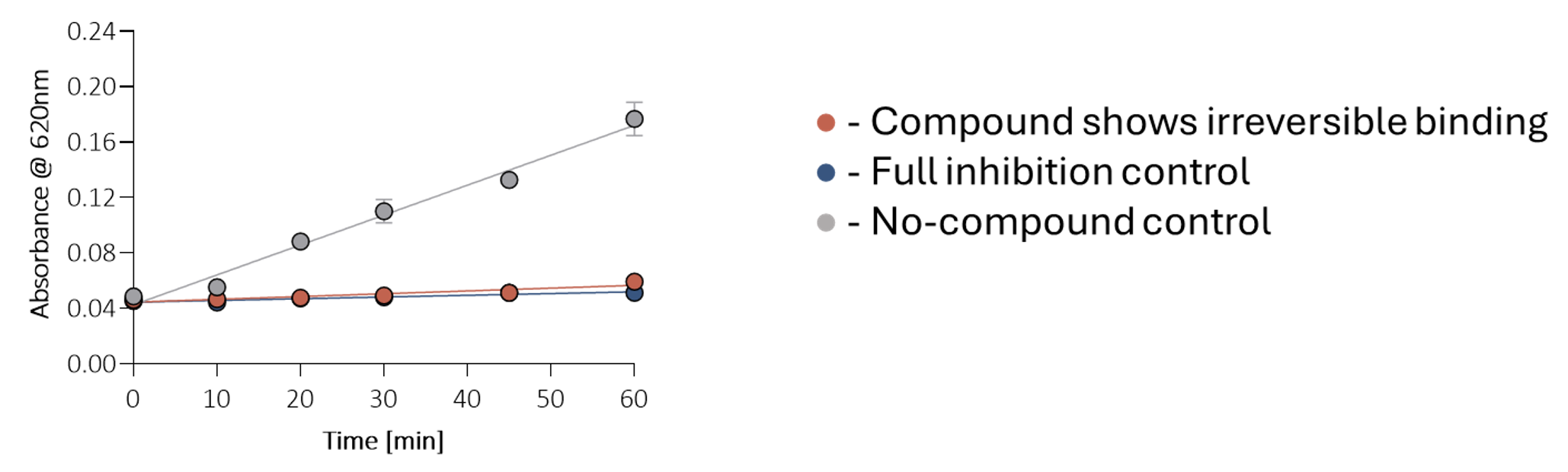 Figure 7. The jump dilution assay. The inhibitor is pre-incubated at 10xIC50 concentration with 100xFAC enzyme concentration, then diluted 1:100 into the active assay, and enzyme activity is monitored over time. Persistent inhibition after dilution indicates irreversible binding. Fully inhibited and no-compound controls were included for comparison in each experiment.