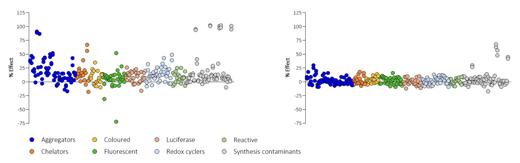 Figure 3. Initially, the assay was inhibited by various compounds, including aggregators, chelators, redox cycling compounds and divalent cations (left). The buffer was modified by optimising the composition and concentration of detergent, reducing agent, carrier proteins and the introduction of mild chelating agents, which dramatically reduced assay interference (right), although some inhibition by divalent cations remained.
