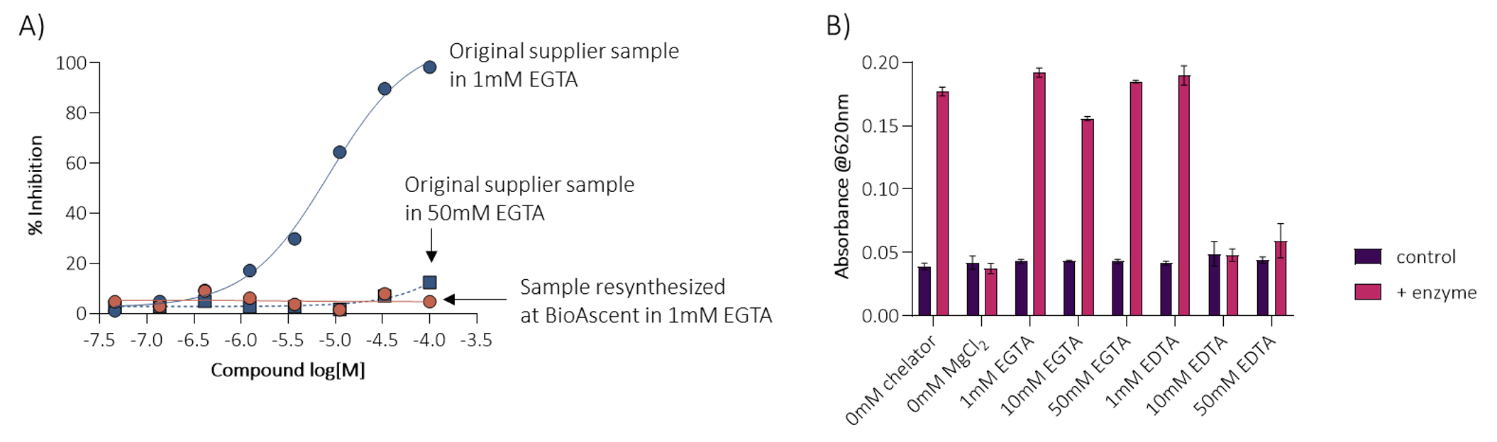 Buffer optimisation during initial assay development was essential to minimise the target’s sensitivity to interference compounds. Despite this optimisation, some hits could not be re-confirmed after resynthesis, even though they initially appeared to be active. Further analysis revealed that high concentrations of chelators were necessary to restore enzyme activity, indicating that significant metal contamination was present in some library samples.