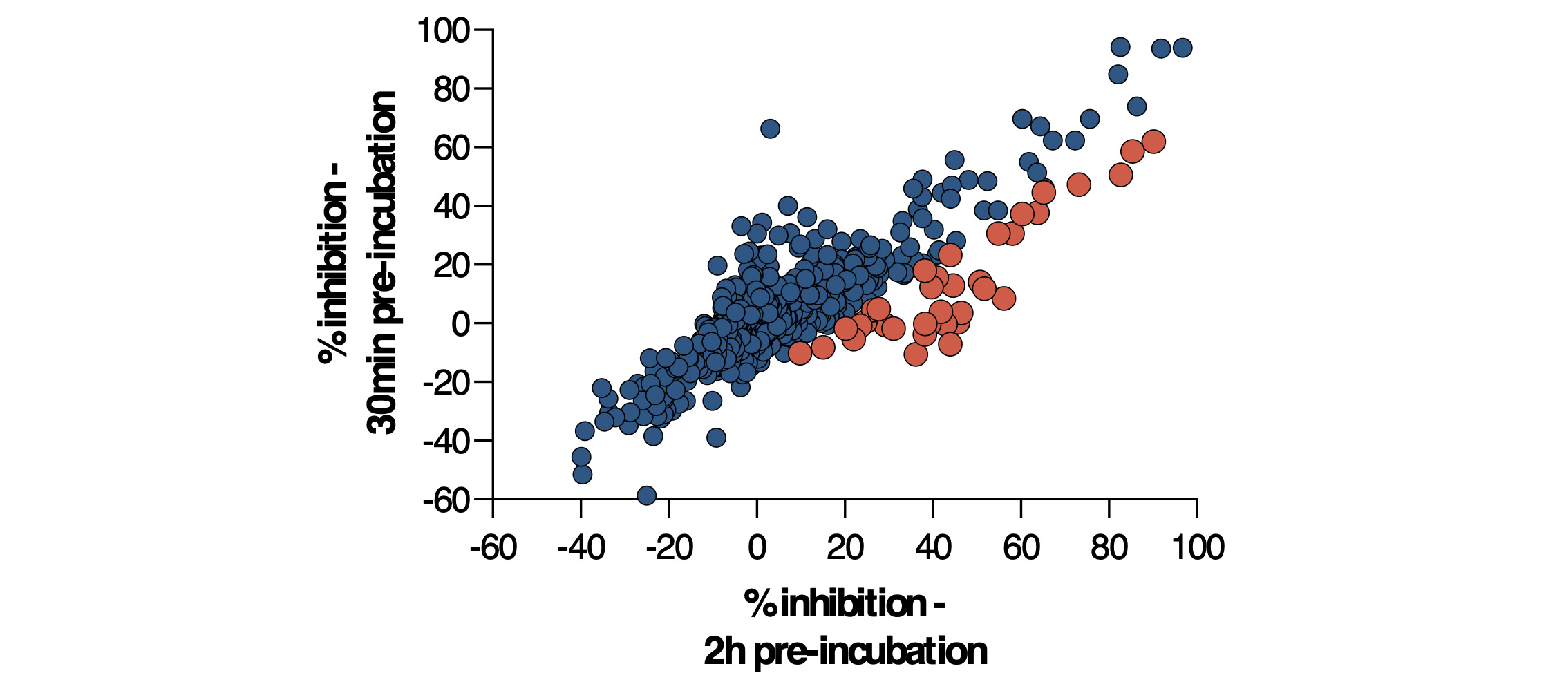 Figure 4. 77 compounds were flagged as primary hits from the 30-minute incubation screen. Of these, 38 appeared to show time-dependent inhibition (shown in orange).