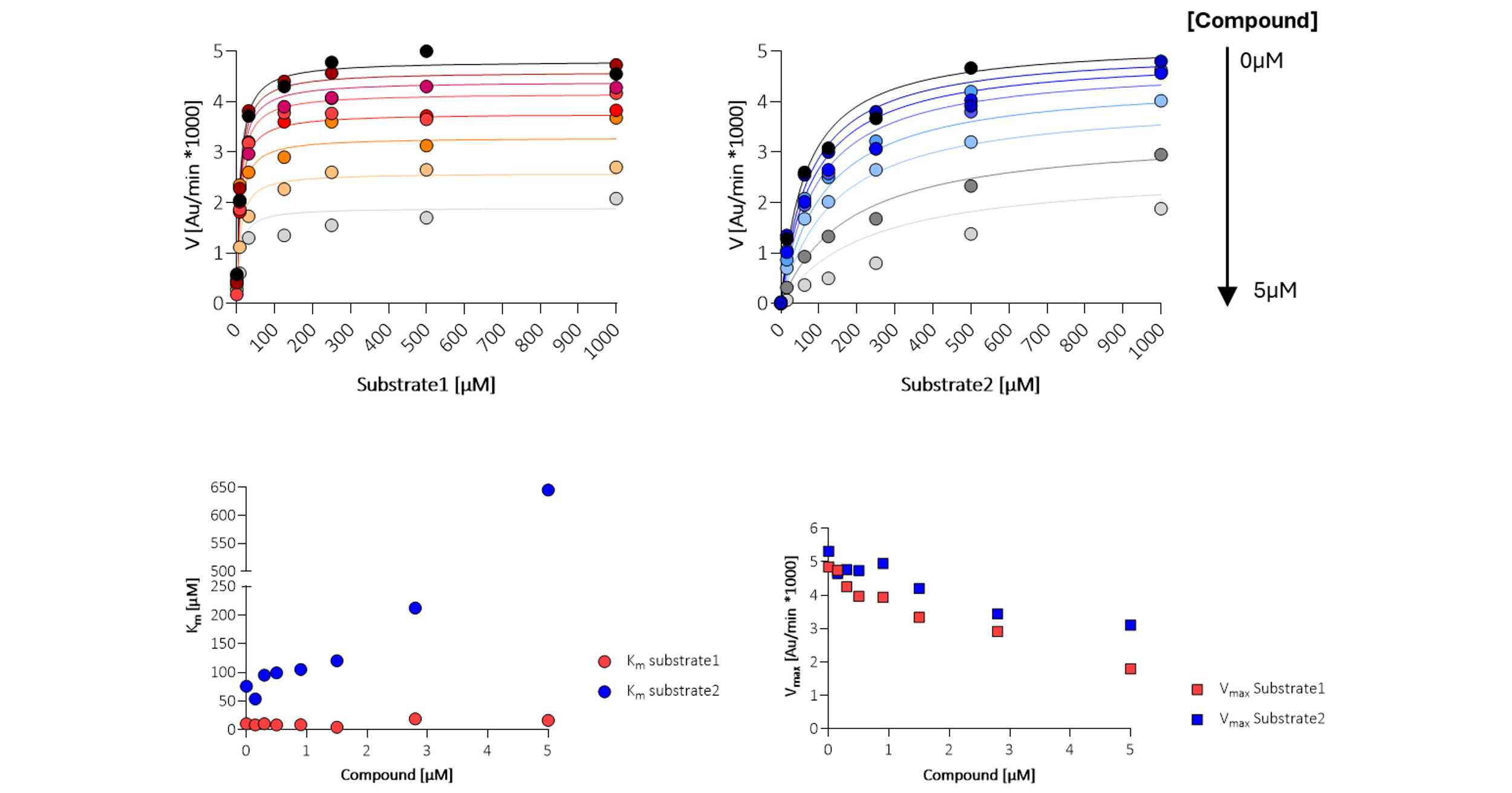 Figure 8. Mode of action studies. Each confirmed inhibitor was analysed for effect on KM (Michaelis constant) and Vmax (maximum velocity) to determine the mode of inhibition, assuming a constant a. The tested compound shows competitive inhibition (blue) for substrate 2 and non-competitive inhibition (red) for substrate 1.