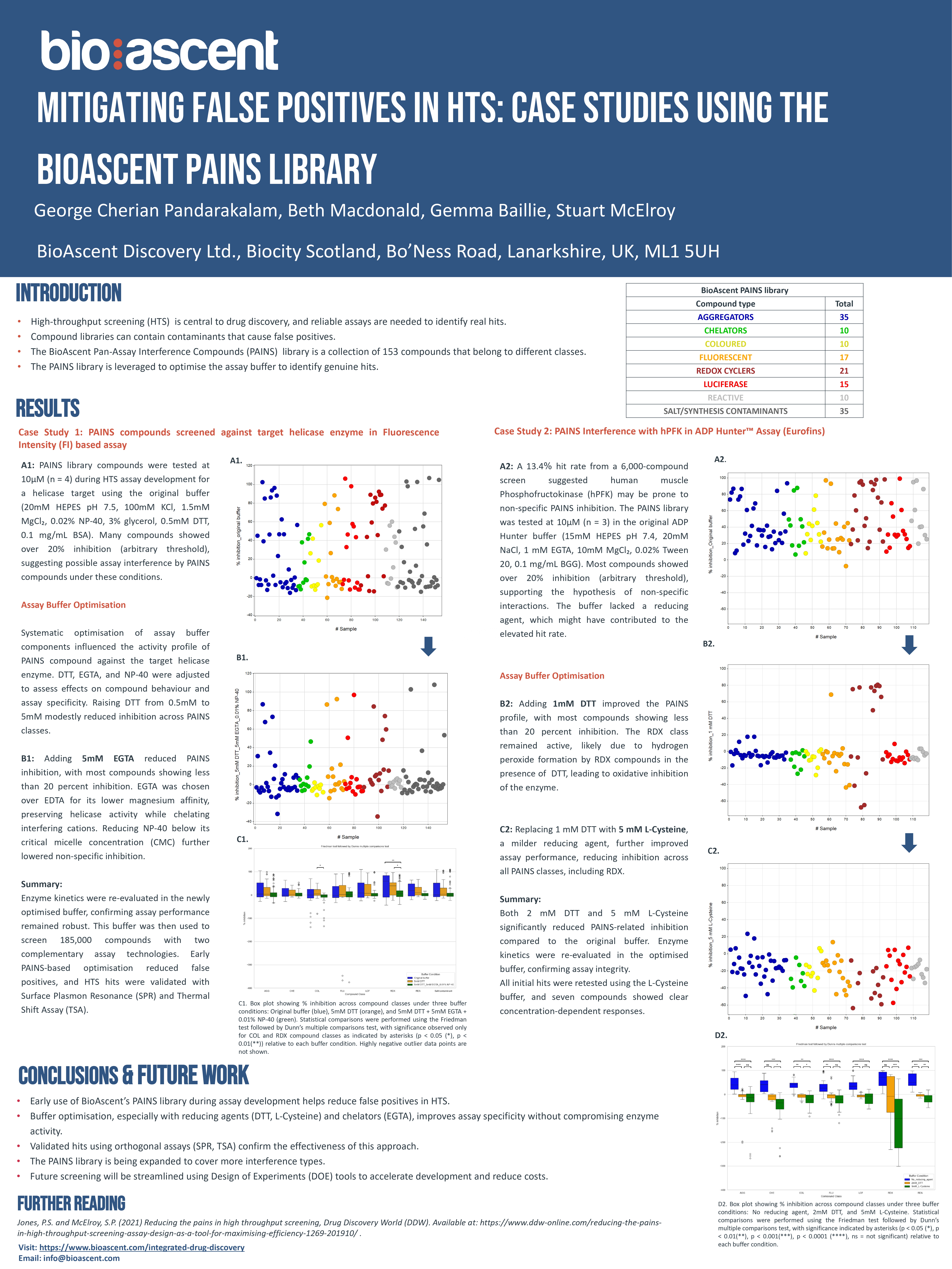 This poster presents two case studies highlighting the strategic use of the PAINS library to improve assay conditions for enzymatic targets - a helicase and human muscle phosphofructokinase (hPFK). In both cases, initial screens showed substantial PAINS-related interference, which was greatly reduced through systematic buffer optimisation, including the introduction of reducing and chelating agents. These changes preserved assay reliability while lowering the incidence of false positives, ultimately improving the overall quality of HTS outcomes.